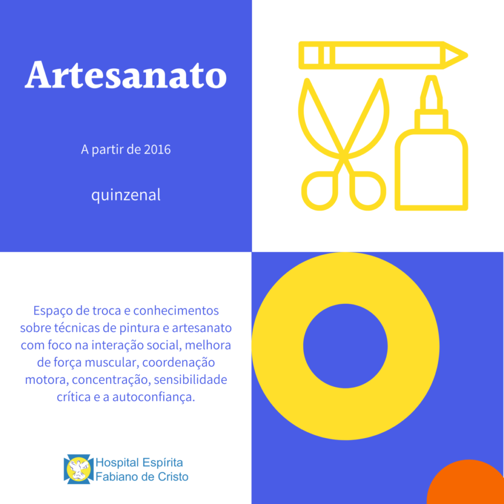 Espaço de troca e conhecimentos sobre técnicas de pintura e artesanato com foco na interação social, melhora de força muscular, coordenação motora, concentração, sensibilidade crítica e a autoconfiança.