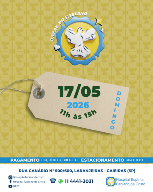 Próximo Bazar do Fabiano, dia 17/05, das 11h às 15h. Ao comprar, você ajuda os nosso atendimentos de retaguarda para pessoas em tratamento do câncer. Rua Canário, 500/600 – Laranjeiras, Caieiras (SP) Estacionamento gratuito